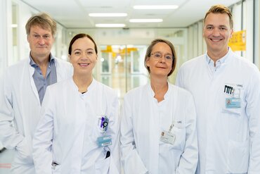 Haben das neue Verfahren an der UMG etabliert: (v.l.n.r.) Prof. Dr. Veit Rohde, Direktor der Klinik für Neurochirurgie der UMG, Priv.-Doz. Dr. Charlotte Flüh, Oberärztin der Klinik für Neurochirurgie der UMG, Prof. Dr. Andrea Hille, leitende Oberärztin der Klinik für Strahlentherapie der UMG und Prof. Dr. Stefan Rieken, Direktor der Klinik für Strahlentherapie und Radioonkologie der UMG sowie Sprecher des UniversitätsKrebszentrums Göttingen. Foto: umg/johann-jesko lange